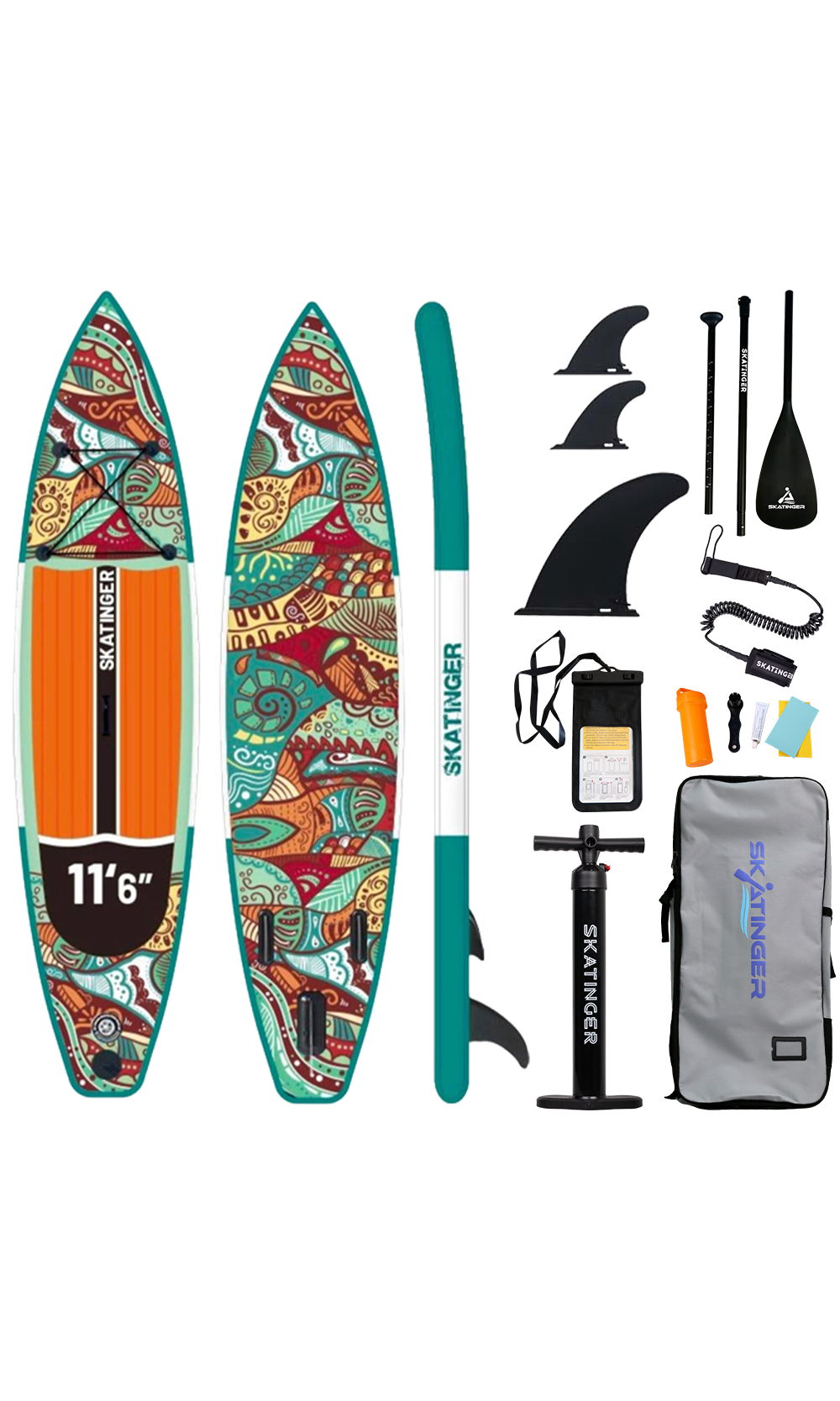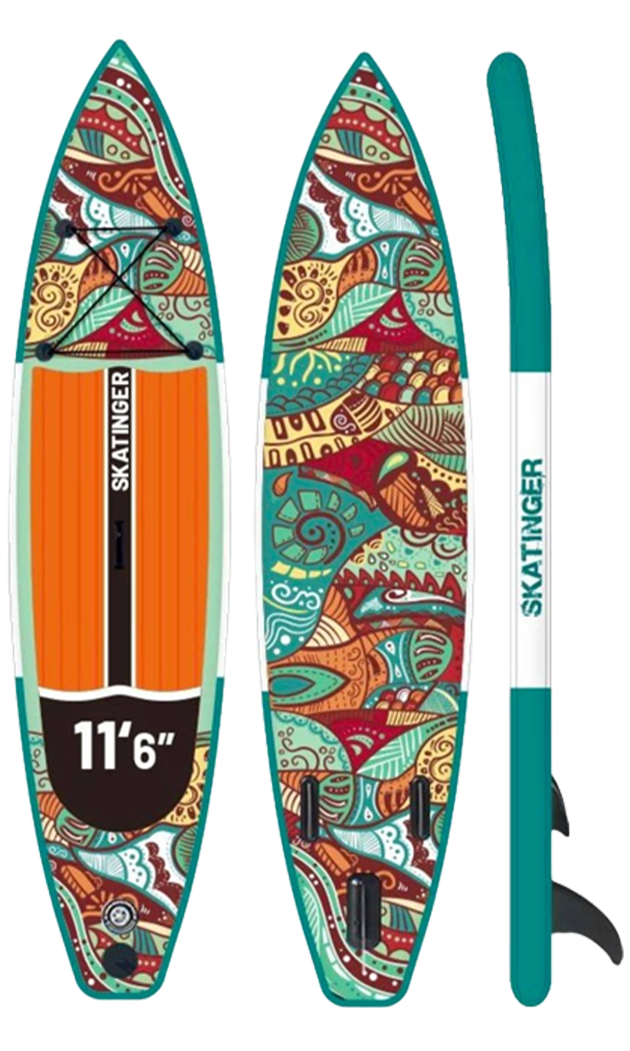Con una lunghezza di 350,5 cm e una larghezza di 81,3 cm, Norm garantisce una tracciatura affidabile e un equilibrio confortevole, ideale per il touring leggero, la pagaiata ricreativa o lunghe giornate sull’acqua. Il pad EVA arancione caldo crea un forte contrasto con i motivi dinamici sottostanti, mentre la costruzione drop stitch a singolo strato assicura agilità senza compromettere la struttura.