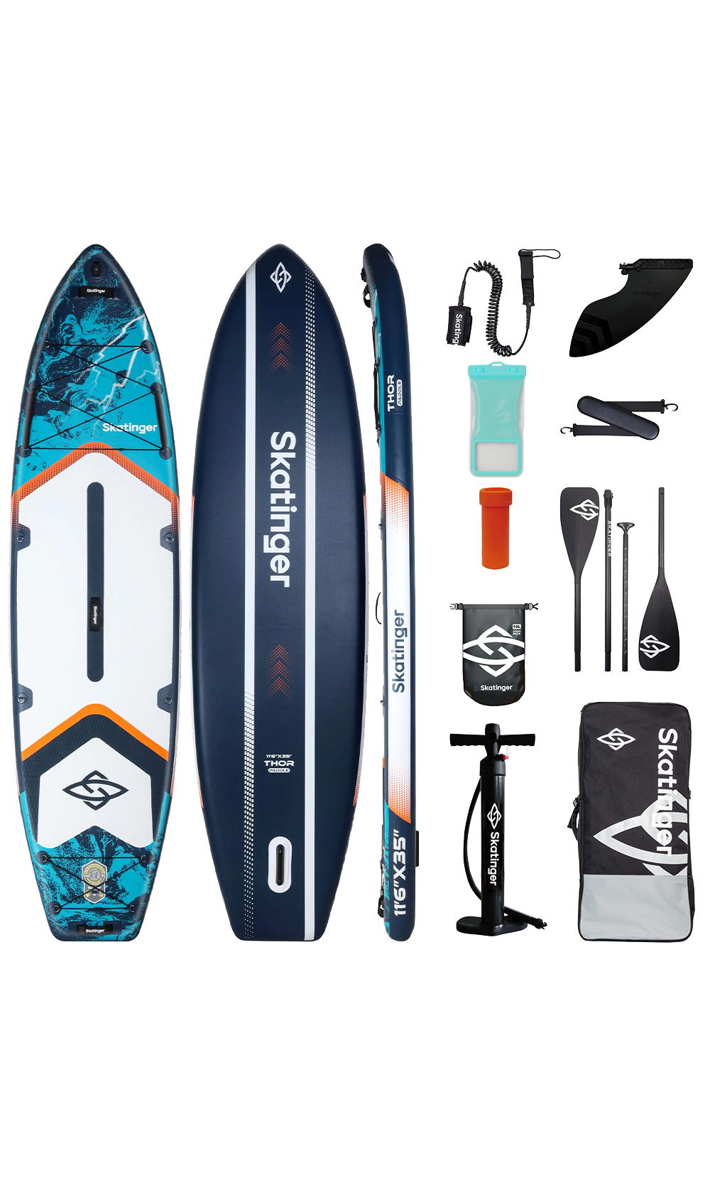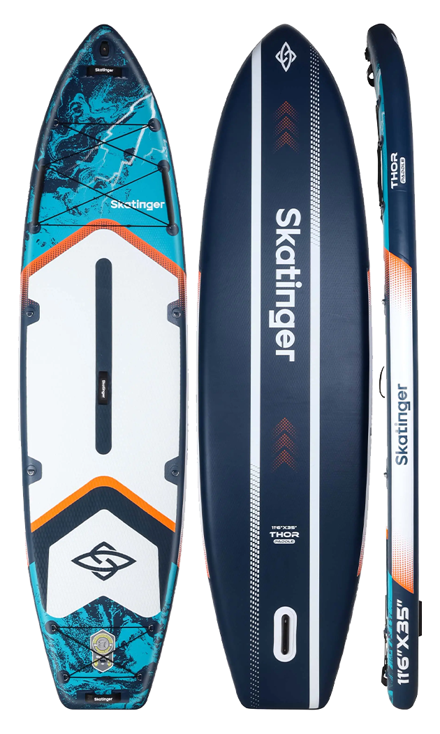 Parte della linea di tavole leggere Skatinger, Thor Blue combina dimensioni importanti con una maneggevolezza sorprendentemente semplice. La costruzione leggera facilita il trasporto e la preparazione, mentre la struttura rinforzata drop-stitch mantiene la tavola rigida e stabile una volta gonfiata. Con una lunghezza di circa 350 cm e una larghezza di 89 cm offre ottima scorrevolezza, traiettoria stabile e equilibrio affidabile per paddler di ogni livello di esperienza.